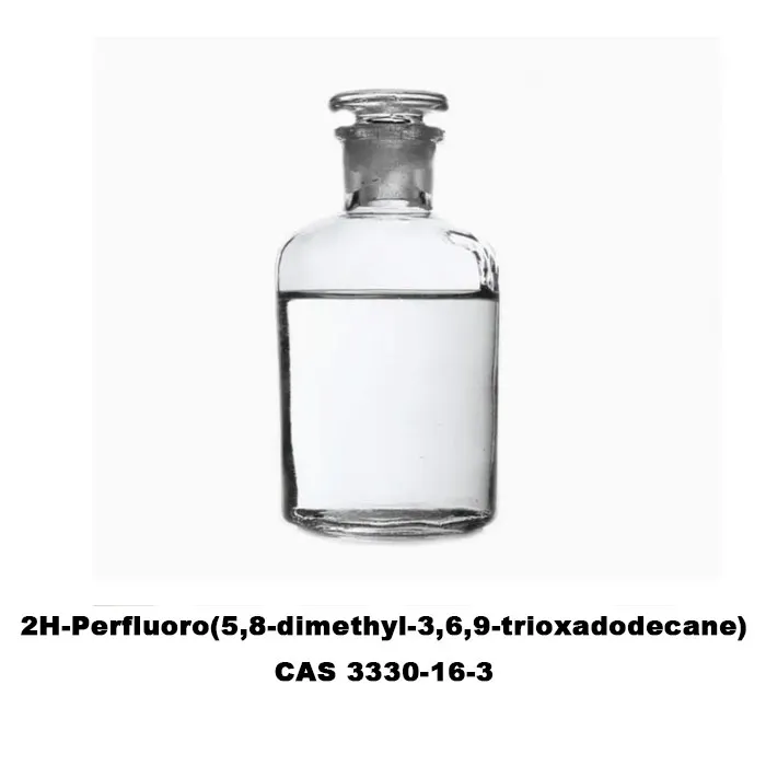 2H-Perfluoro(5,8-dimethyl-3,6,9-trioxadodecane) (CAS 3330-16-3) is a perfluoropolyether (PFPE) derivative with a molecular weight of about 400-450 g/mol. It is a colorless, transparent, and low viscosity liquid at room temperature. This compound has the characteristics of a typical perfluoro compound: high density (1.7-1.9 g/cm³), boiling point exceeds 200℃, and exhibits excellent thermal stability (resistant to high temperatures above 300℃) and chemical stability (resistant to strong acids, strong alkalis and Oxidanty) . Jeho rozpustnost je obzvláště rozpustná a může být rozpustná ve fluorovaných rozpouštědlech (jako je perfluorohexan) a některé ethery, ale je nerozpustná ve vodě, alkoholu a rozpouštědlech uhlovodíků .
